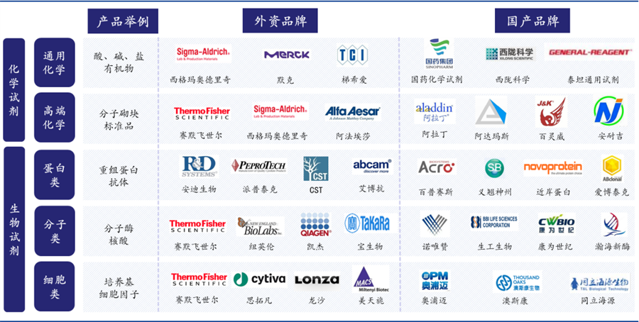 生命科学工具和服务生命科学服务包含科研试剂、实验耗材、仪器设备和综合服务四大类:1、科研试剂(1)化学试剂:通用化学试剂、高端化学试剂龙头企业:外资龙头:赛默飞
