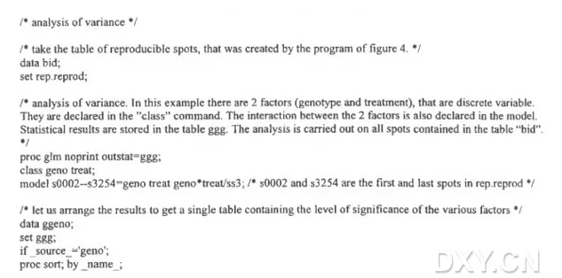 经过方差分析后,根据具体的生物学问题可以使用不同的比较方法。如 Dunnet 测试适用于同一控制条件下不同的处理方法进行对比,Duncan 或 Student-Newman-Keuls 测试适用于所有处理间的比较(见注释 5) 。线性回归适用于计算点与连续变量(如激素的剂量)之间的关系。图 16-5显示了选择所有点的 SAS 编程程序,这些点显示了在两因素方差分析中显著的变化及因素间的相互作用(见注释 6)。