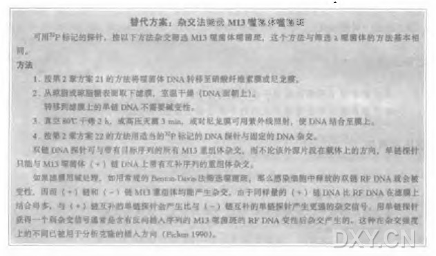 17. 用少量体积的水 4℃ 过夜溶解大规模反应体系中的 DNA, 目的是使其终浓度达到约 500 μg DNA/ml。可通过琼脂糖凝胶电泳估测 DNA 浓度,最好测定 A260。