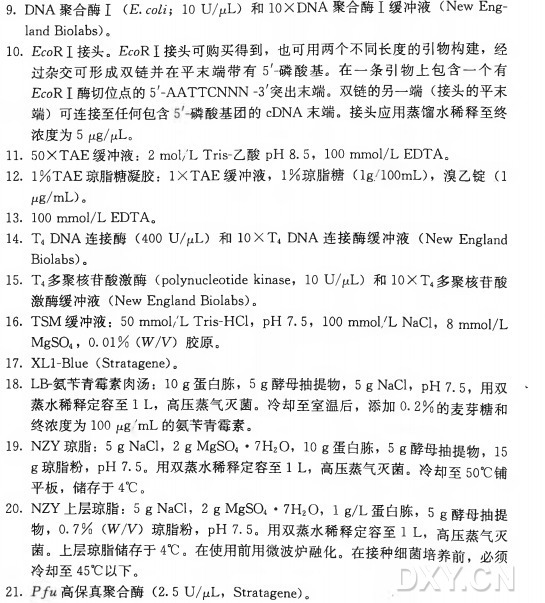 ![1. cDNA文库构建的克隆载体。现已有许多载体,各有其特别的用途,研究者应 根据其特性挑选恰当的载体。一些使用较广泛的 cDNA文库构建载体包括: Uni-ZAPXR (Stratagene)、 plTriplEx2 (Clontech)、 pSPORTl (Invitrogen)、 130^££1^-1(1^〇¥&8611/]\46]:〇 10。本章将以1711卜2八?父1^克隆载体为例。 2. 1/xg经过柱纯化的mRNA。 3 . 含 多 聚 ( dT) 区 域 的 寡 聚 核 苷 酸 连 接 物 - 引 物 ( linkerprimer) [例 如 5'- NNNNNNNNCTCGAGdT (15) -3’] 。 4. 核糖核酸酶抑制剂( RNasin, 2 0 U//iL ; Pr〇 mega)。 5. AMV反 转 录 酶 (10 U" L) 和 IOX反转录缓冲液( Promega)。 6 . 核 苷 酸 ( dATP、 dTTP、 dGTP 各 l 〇 mmol/L)。 7. 5-甲基胞嘧啶类似物(dCTP~J_5_mmol._~9_L~B。 8. RNase H (5 U '/ uL; New England Biolabs)。](/uploads/allimg/20240620/1-24062021334LT.jpg)