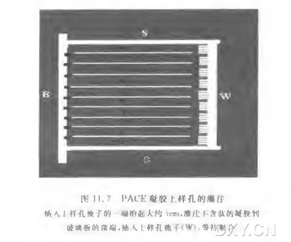 3. 针对 PACE 凝胶,梳子和垫片要进行一定的切割,如图 11.5 所描述对梳子和垫片进行切割,切割以后的凝胶可以包括 10 个肽浓度。