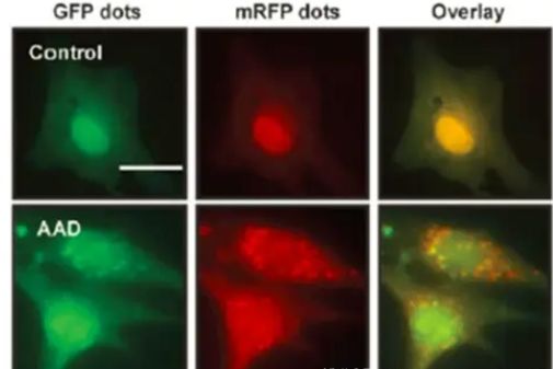 无自噬时,GFP-LC3在胞浆中弥散分布;自噬形成时,GFP-LC3聚集于自噬体膜上。在荧光显微镜下形成多个明亮的绿色荧光斑点,观察到的点状聚集的数目即为自噬体的数量。
