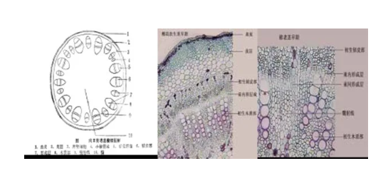 (1)木栓层:在残留的表皮(死细胞)之下,为多层按半径线整齐排列的细胞。没有胞间隙,胞壁加厚并栓质化,细胞中无生活物质,无核,是死细胞。所以木栓层既不透水,也不能透气。