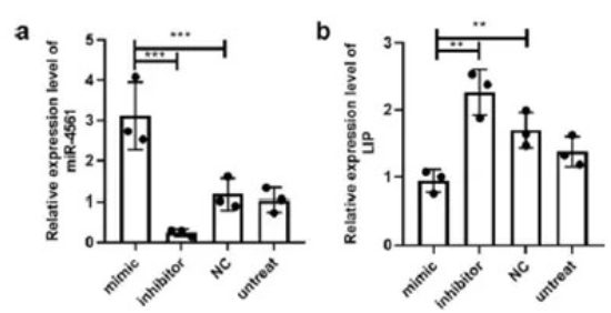 发表在《COMMUNICATIONS BIOLOGY》期刊上题目为“MicroRNA expression profile in Lampetra morii upon Vibrio anguillarum infection and miR-4561 characterization targeting lip”的论文写道:根据制造商的说明,使用含有 10% 葡萄糖的 Entranster(Engreen,北京,CHN)试剂将 miR-4561 模拟物、抑制剂和 NC 转染到七鳃鳗的神经上体组织中,并通过 miR-4561的 qRTPCR 评估转染效率,注射mimic组的miR-4561表达较对照组显著上升,注射inhibitor组的表达较对照组显著下降。