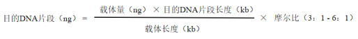(2) 连接:按照 T 载体说明书(Takara 6011)进行连接,目的 DNA 片段与载体的摩尔比建议为 3:1 - 6:1,总质量控制在 100~200 ng,4 ℃ 连接过夜或者 16 ℃ 2~3 h。